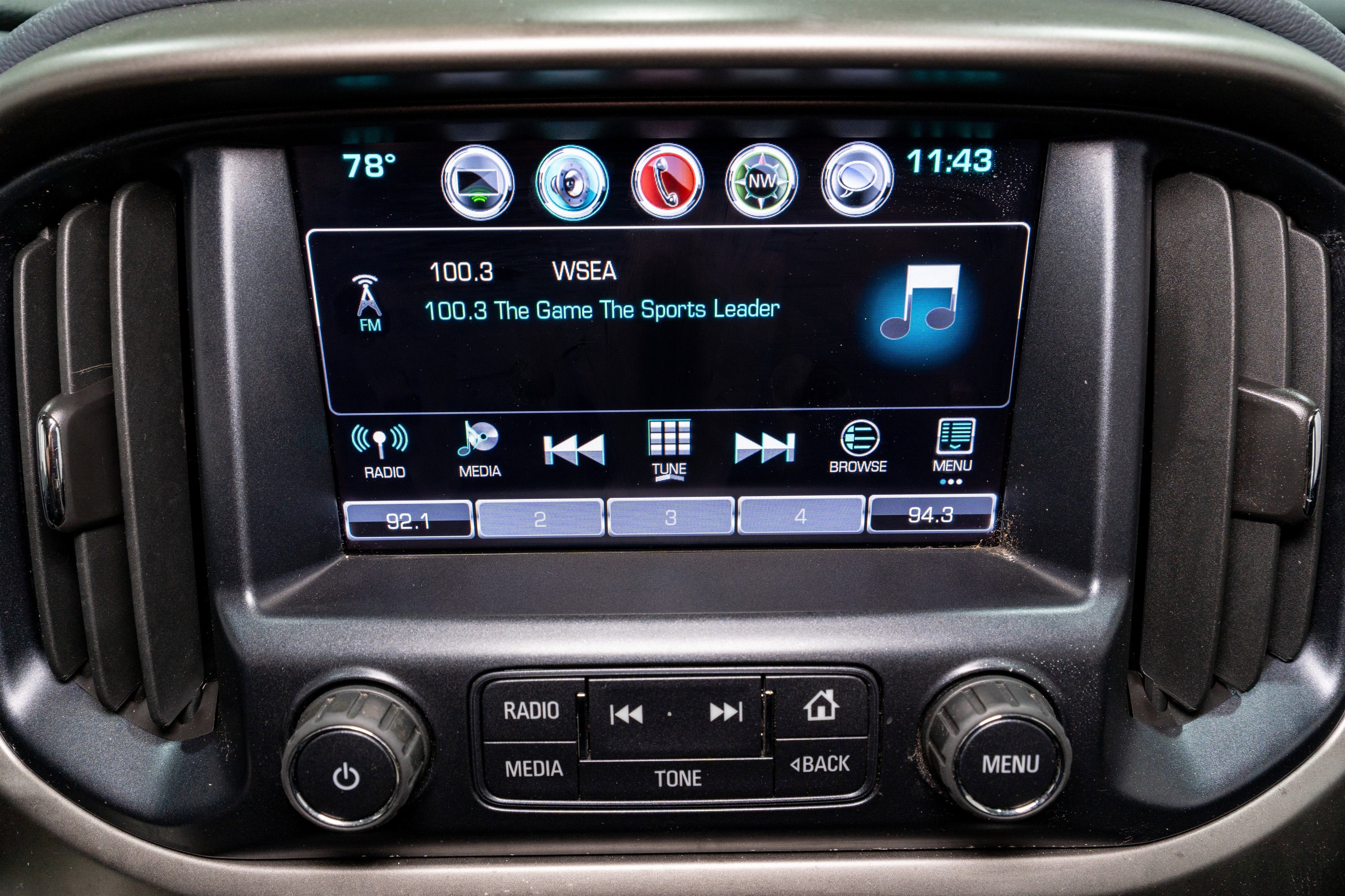 - Audio System, Chevrolet MyLink Radio with 8" diagonal color touch-screen, AM/FM stereo seek-and-scan and digital clock, includes Bluetooth® streaming audio for music and select phones; voice-activated technology for radio and phone; featuring Apple CarPlay capability for compatible phone; includes auxiliary jack